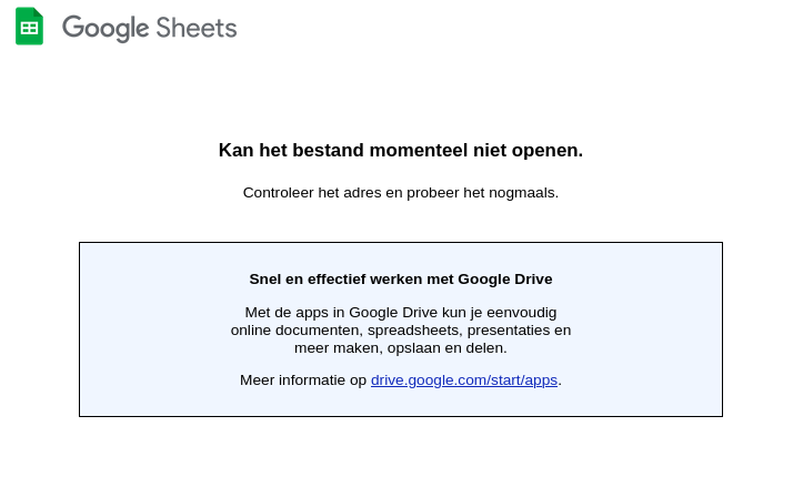 Ik heb de sheet in geheel naar een andere account geupload en delen daar ingesteld, maar ik krijg daar dezelfde foutmelding. Ik veronderstel dus dat iedereen hier hinder van ondervind? Als dat niet zo is hoor ik het graag, dan moet ik in onze omgeving verder zoeken.