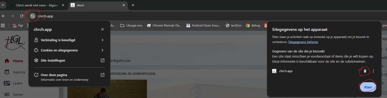 ja sorry, ik was niet duidelijk, het gaat om de cookies die de browser bewaart. Hoe die te wissen is afhankelijk van de browser die je gebruikt. Typisch iets als ‘instellingen’,‘privacy’,‘data beheren’, dat soort termen, het verandert ook voortdurend heb ik het idee. En dan de cookies die door chrch.app zijn gezet verwijderen.