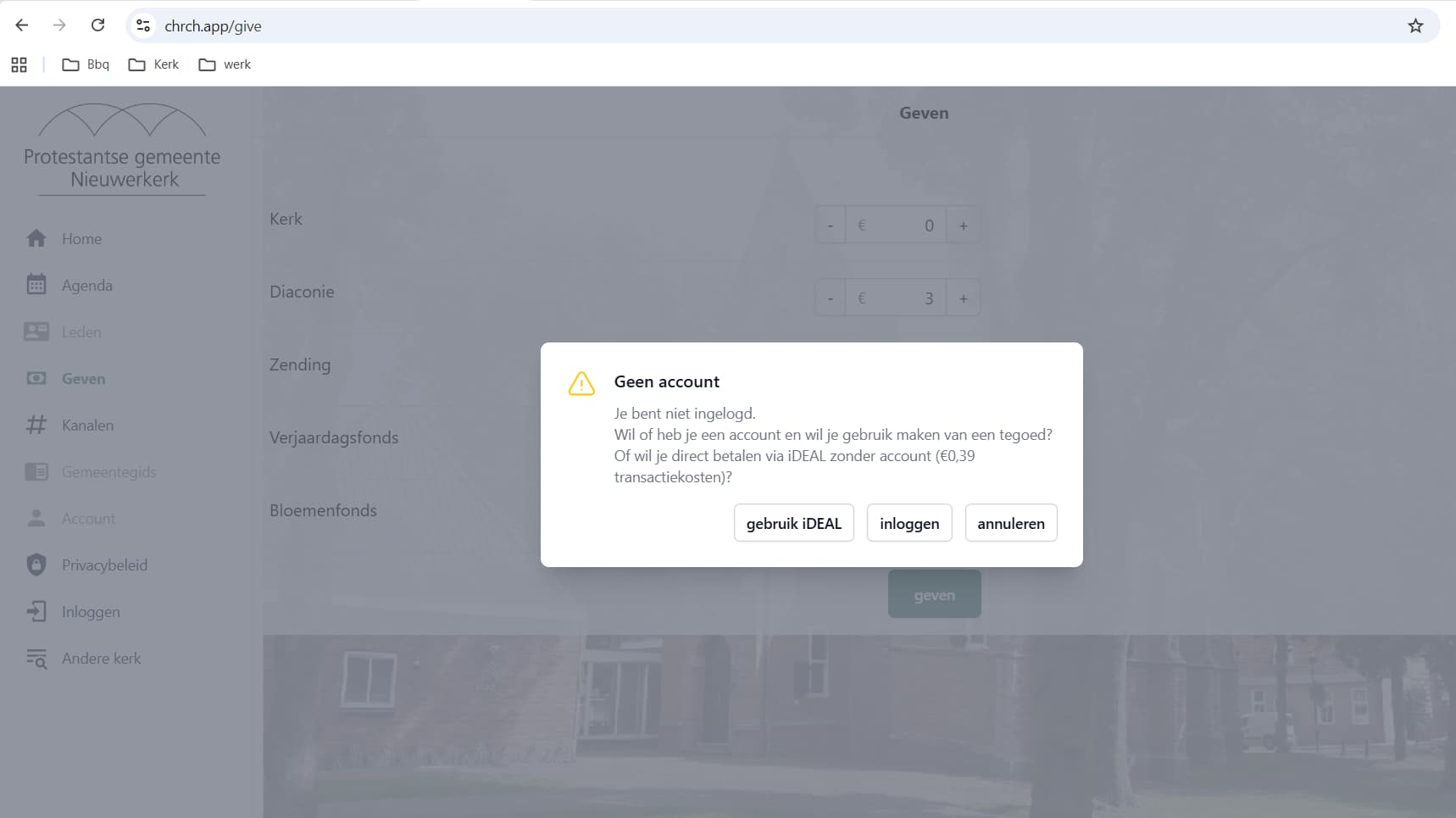 https://demo.chrch.app/give en dan demo vervangen voor wat je zelf hebt ingesteld onder instellingen > organisatorisch > URL